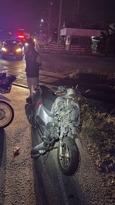 เมื่อเวลา 01.30 น. พนักงานสอบสวน สภ.พานทอง พร้อมด้วยหน่วยกู้ภัยสว่างอุทยานพานทอง เข้าตรวจสอบหลังได้รับแจ้งเหตุรถจักรยานยนต์ชนโบกี้รถไฟ มีผู้บาดเจ็บอาการสาหัส บริเวณทางข้ามทางรถไฟในพื้นที่ดังกล่าว