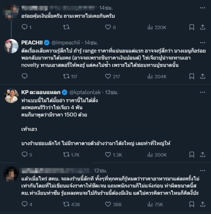 ทำแบบนี้ไม่ได้มั้ยอ่า ราคานี้ไม่ได้สั่ง ละพอคนรีวิวว่าไข่เจียว 4 พัน คนก็มาพูดว่ามีราคา 1,500 ด้วย เท้าเอว บางร้านชอบลักไก่ ไม่มีราคาตายตัว อ้างว่ามาโต๊ะใหญ่ เลยทำที่ใหญ่ให้